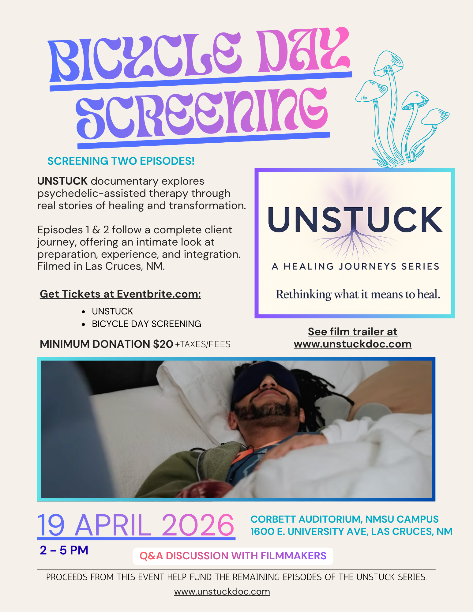 Back to All Events Unstuck Screening (Las Cruces) Sunday, April 19, 2026 2:00 PM 5:00 PM Corbett Center Student Union Auditorium, New Mexico State University International Mall Las Cruces, NM, 88003 United States (map) Google Calendar ICS