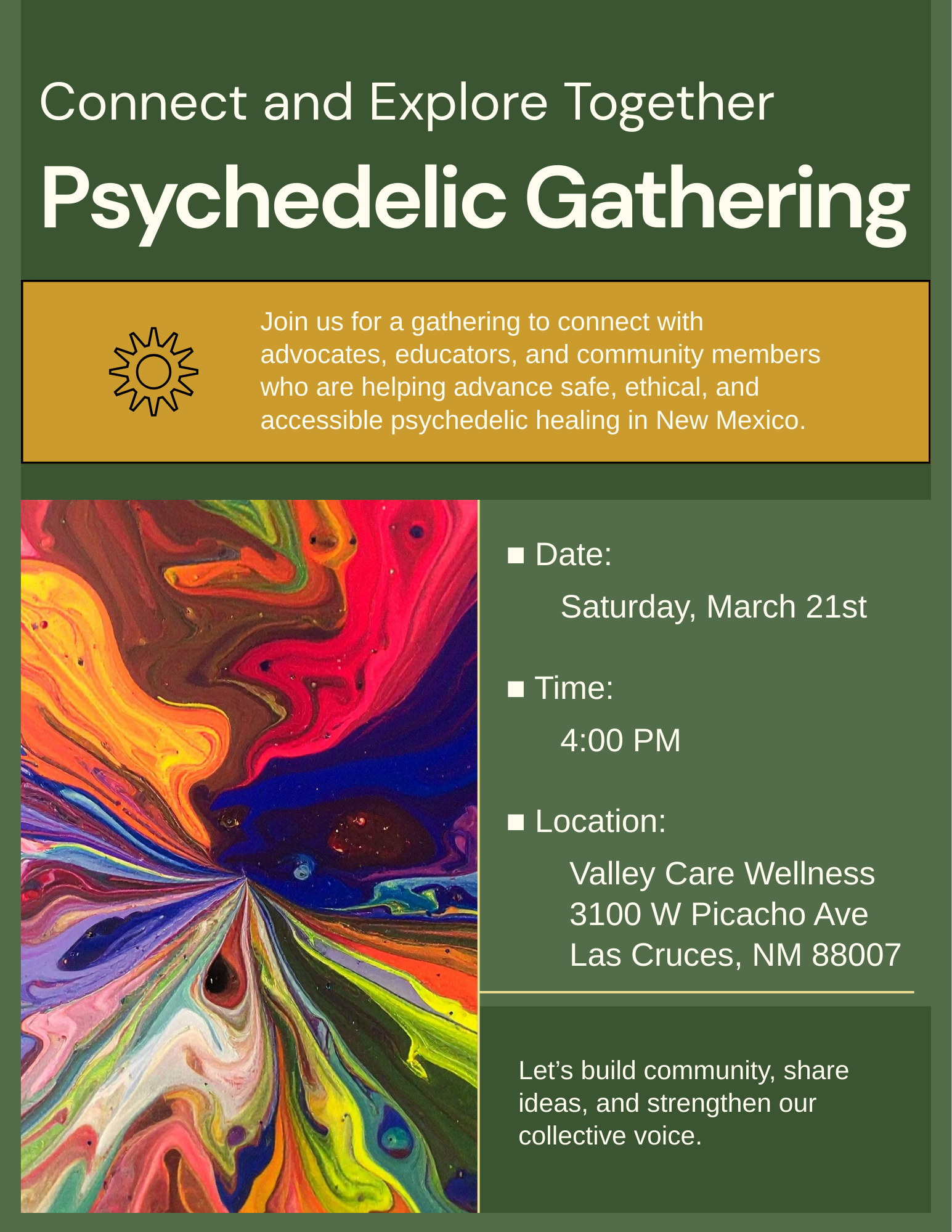 Back to All Events Psychedelic Gathering (Las Cruces) Saturday, March 21, 2026 4:00 PM 6:00 PM Valley Care Wellness 3100 West Picacho Avenue Las Cruces, NM, 88007 United States (map) Google Calendar ICS